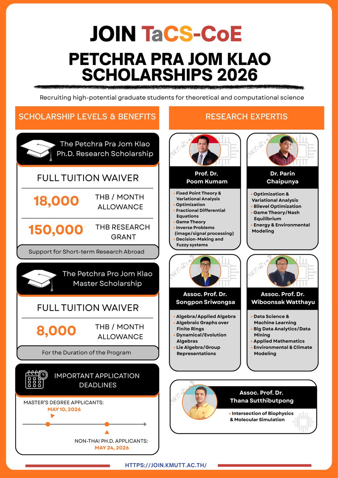 Join a vibrant research community at KMUTT and take the next step in your academic journey with the Petchra Pra Jom Klao Scholarships 2026. We are seeking high-potential graduate students passionate about theoretical and computational sciences to be part of our dynamic team of experts. With full tuition waivers, generous monthly allowances, research grants, and opportunities for international research experience, this is your chance to grow, innovate, and make an impact. Don’t miss the opportunity to shape your future—apply now and become part of our excellence-driven community!