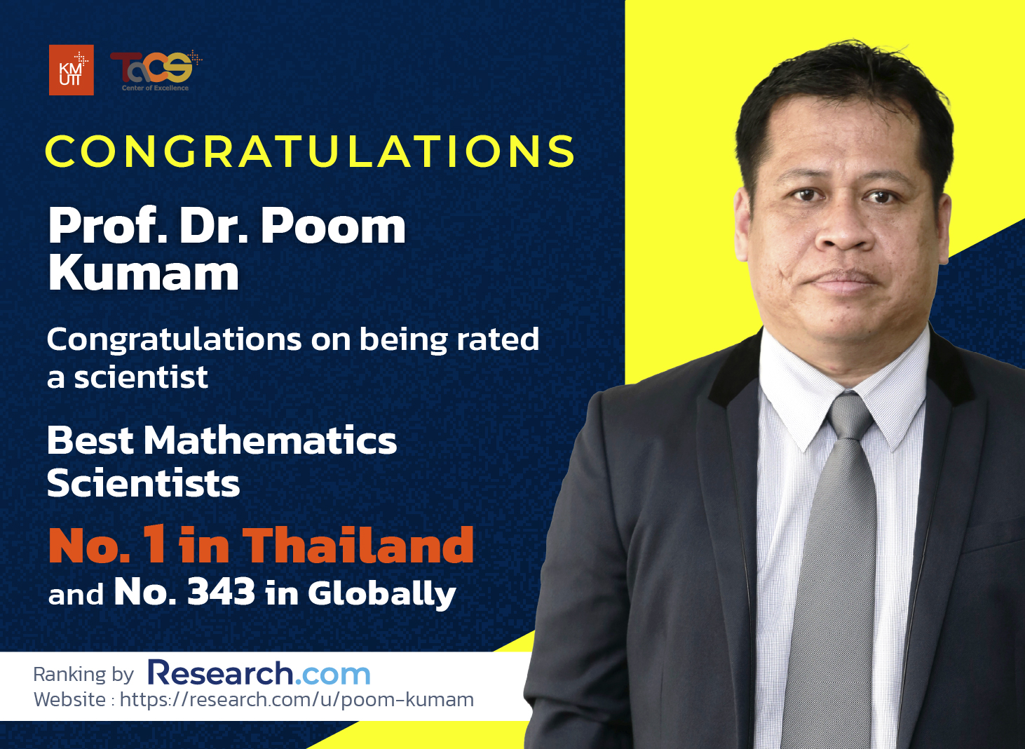 We proudly extend our heartfelt congratulations to Prof. Dr. Poom Kumam on being recognized as the No. 1 Mathematics Scientist in Thailand and ranked No. 343 globally by Research.com. This remarkable achievement reflects his outstanding dedication, impactful research contributions, and unwavering commitment to advancing the field of mathematics.