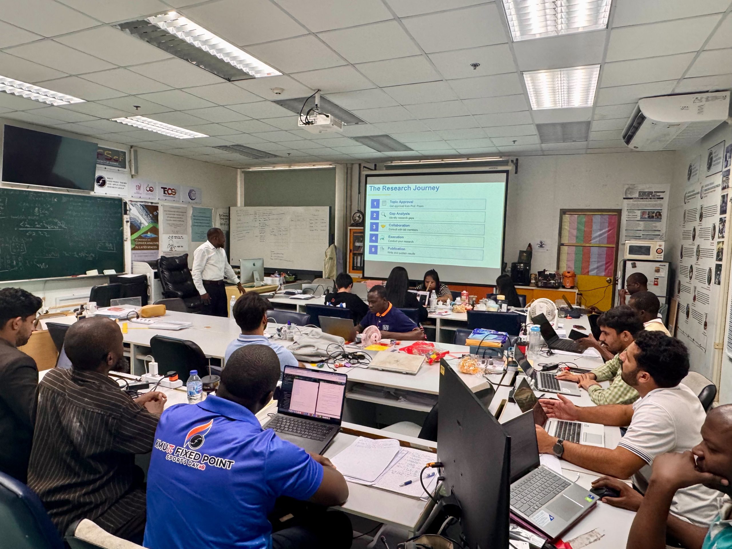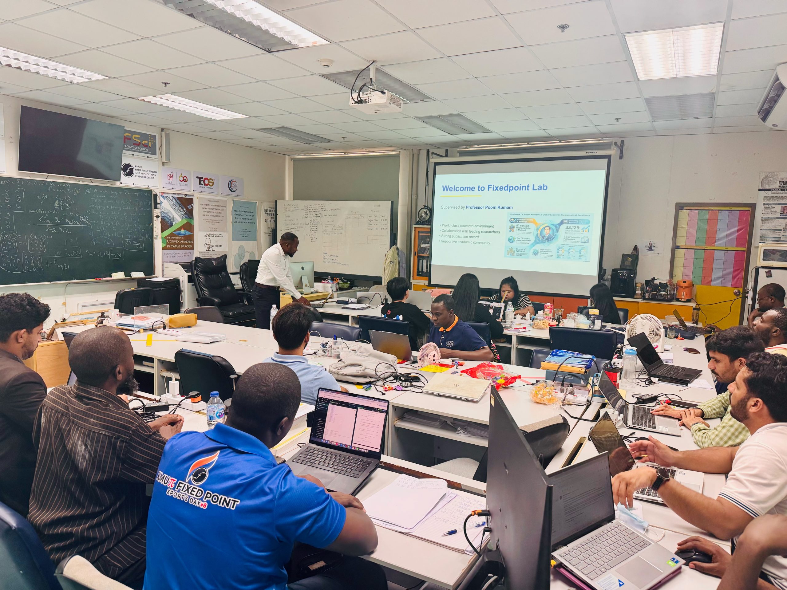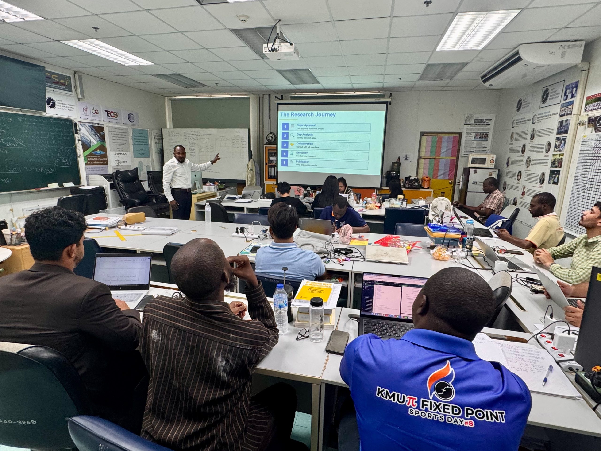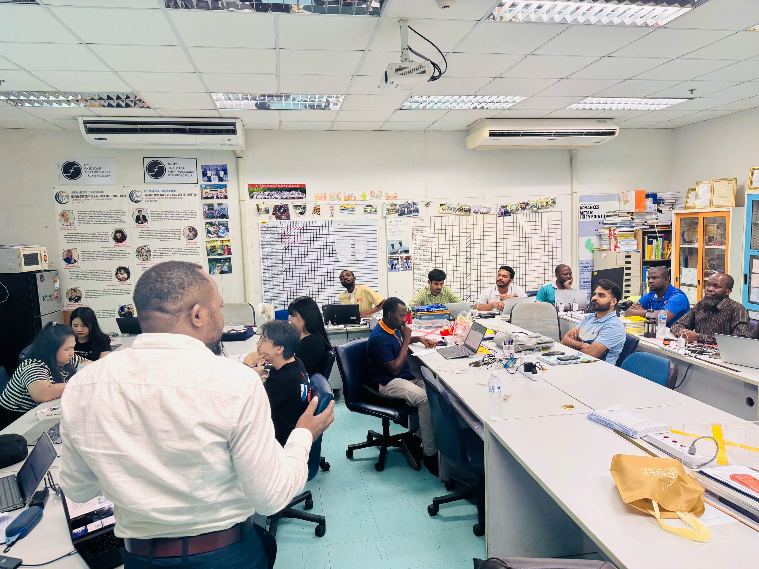 A special lecture was delivered by Dr. Jamilu Abubakar, a postdoctoral researcher from King Mongkut’s University of Technology North Bangkok (KMUTNB), on Thursday, 5 February, at 1.00 p.m. at the Fixed Point Research Laboratory (SCL 802), KMUTT. The session provided valuable insights into research practices, academic experiences, and research pathways in the postdoctoral research environment.