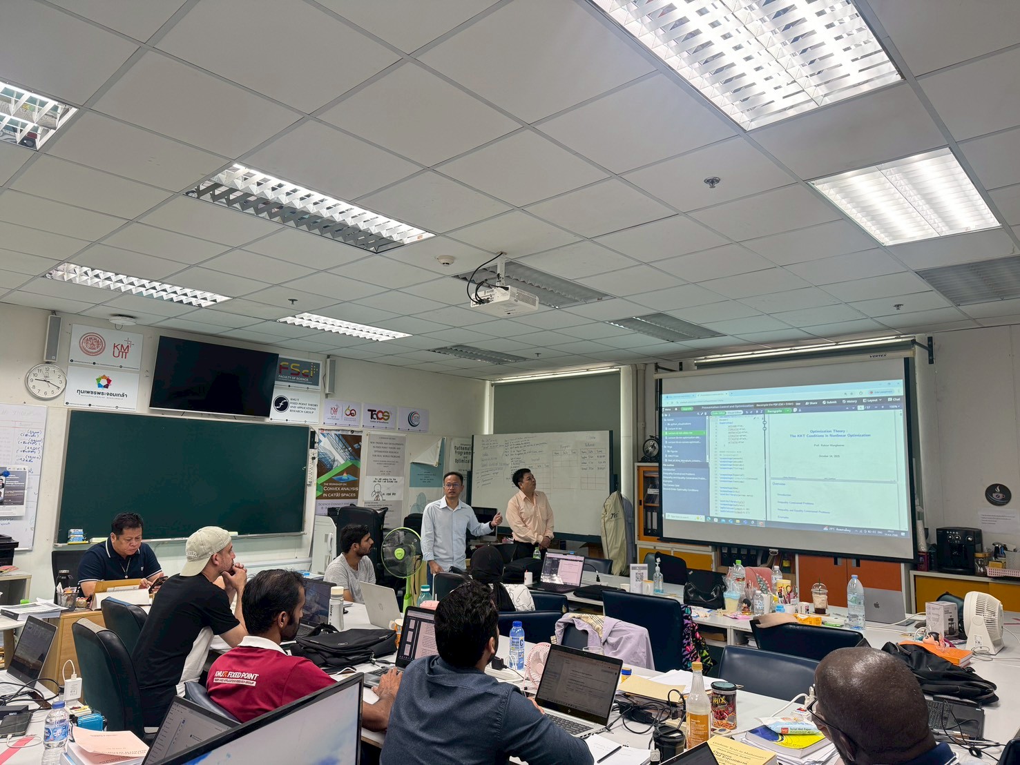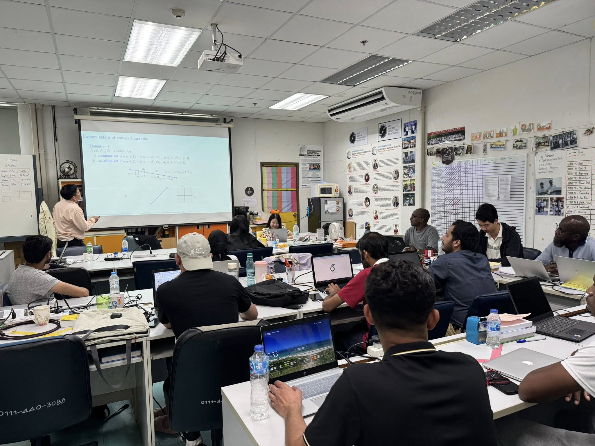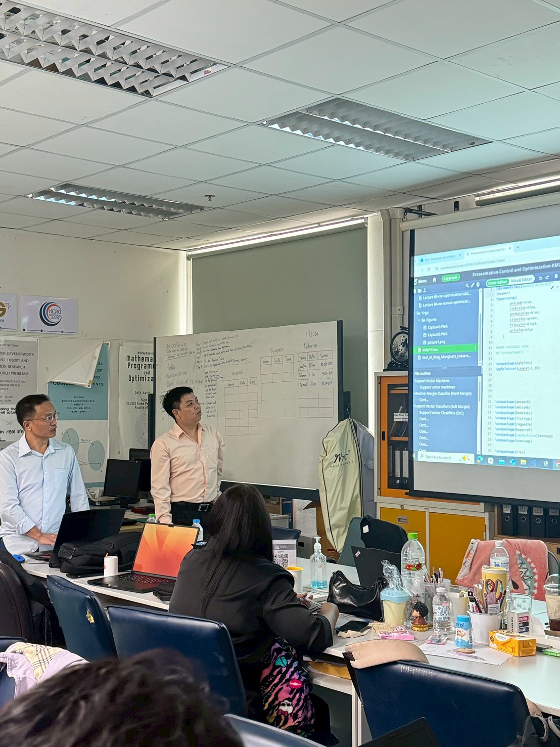 Assoc. Prof. Dr. Kasamsuk Ungchittrakool delivered an engaging lecture on “Mathematical Background and Notations in Convex Optimization”, providing participants with a strong foundation for understanding optimization problems. This was followed by Prof. Dr. Rabian Wangkeeree’s session on “Optimization Theory: The KKT Conditions in Nonlinear Optimization”, which explored crucial theoretical principles for solving nonlinear optimization tasks, bridging theory with practical applications in control and machine learning.